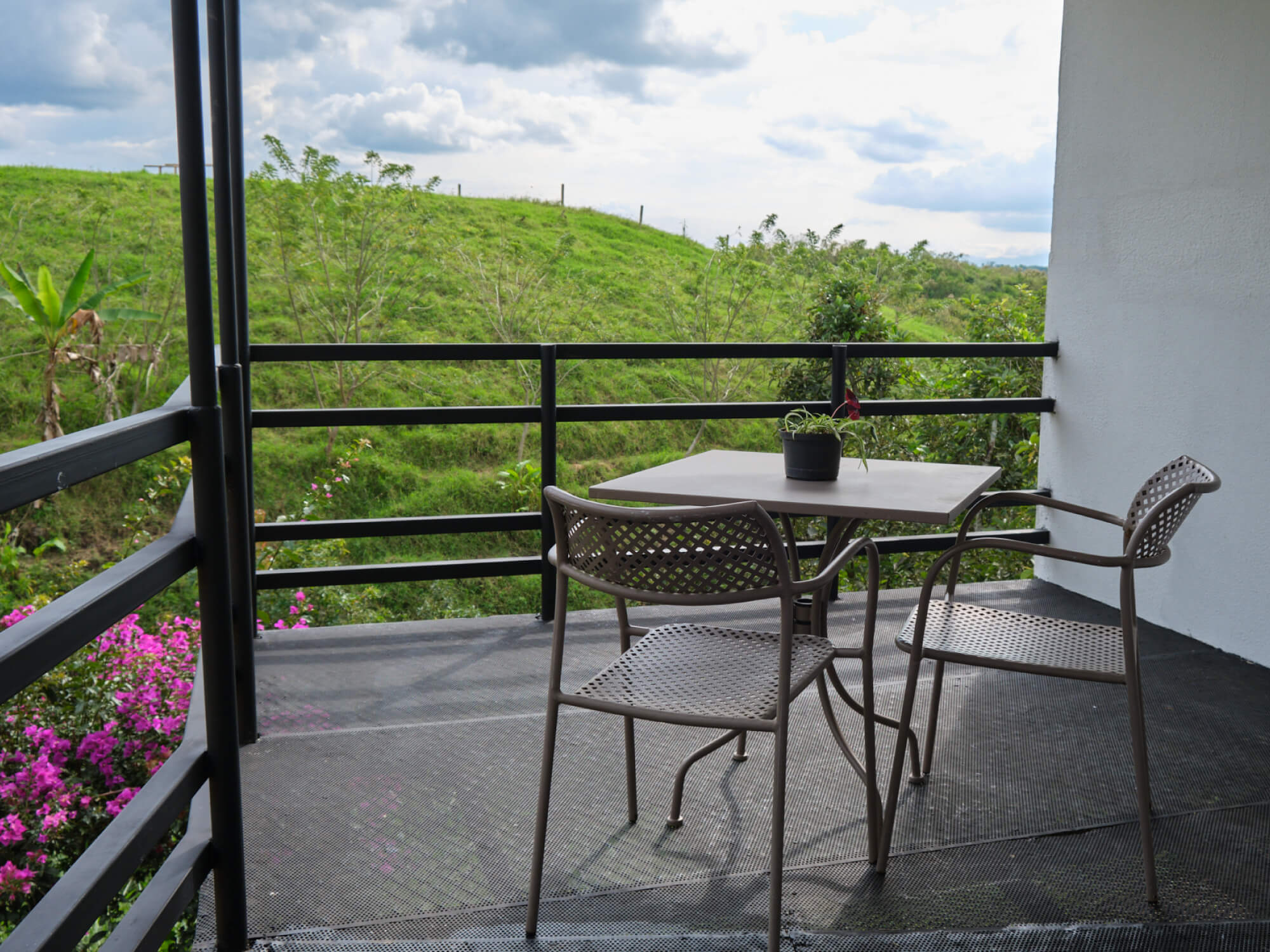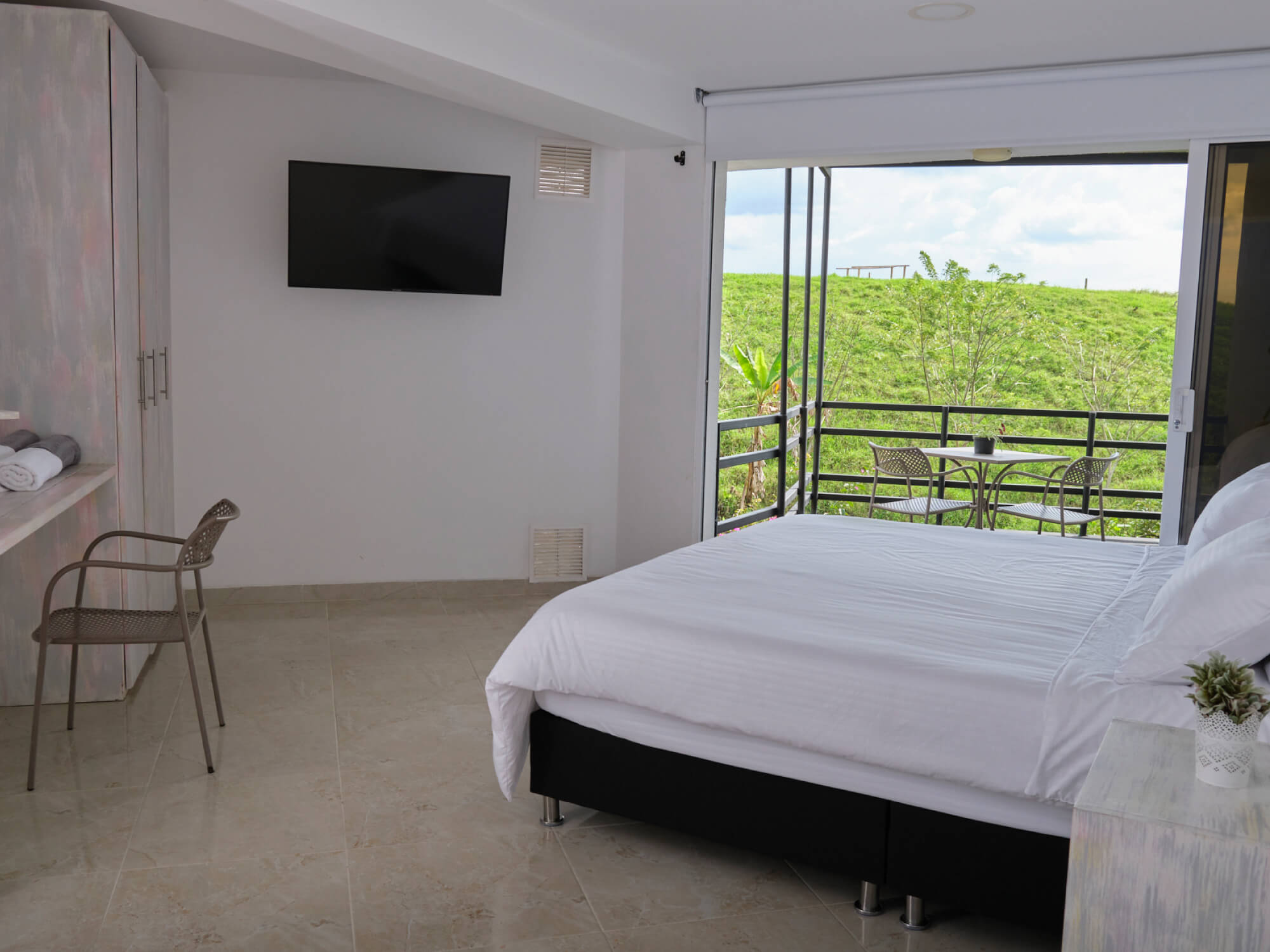 La amplia habitación doble cuenta con armario, sofá, terraza con vistas al jardín y baño privado con ducha. La unidad tiene 1 cama King